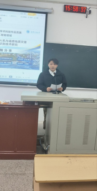 团队代表,2023级研究生樊天伦在分享中谈到,项目直面地质灾害防治中的三大核心难题:多源数据融合不足、模型泛化能力弱、端到端响应延迟高。围绕这些痛点,团队开展了一系列创新研究:首次提出多源遥感大数据地质灾害隐患扫描式识别方法,构建了高动态“孕灾环境+自适应阈值”预警模型,并成功研发出存算传一体化的无人机AI盒子。这些成果显著提升了多源数据融合识别地质灾害隐患点的准确率,增强了综合预警能力,并将应急响应时间从天级缩短至小时级。
