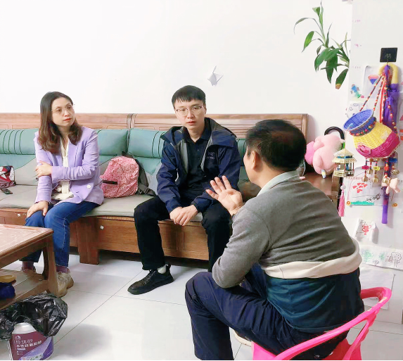家访首站来到学业困难小D家中。辅导员彭超宇结合学生入学以来的学习表现和大一学年的成绩,与家长共同分析学生学业困难的原因,从时间管理、学习方法、心理调适等方面提出具体建议,明确阶段性目标与帮扶措施。成轶强调:“大学是人生重要的转折点,需要家校协同帮助学生建立正确的学习态度与方法。”小D家长表示:“以前总担心孩子在校适应困难,今天看到学院老师如此用心,我们更有信心配合学校做好教育引导。”