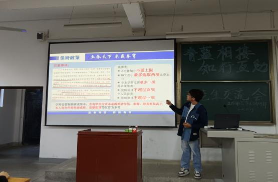 首位分享嘉宾为2021级建筑学专业的肖幕成。他系统梳理了大学期间的竞赛经验与推免心得,并向同学们提出三点建议:第一,课业成绩是发展的基础,应力争保持在专业前列,各科平均分建议不低于88分,并坚决避免不及格情况;第二,积极参与学科竞赛,以此提升综合能力与竞争力;第三,主动联系导师,尽早参与科研项目或论文写作。肖幕成的分享条理清晰、内容务实,为同学们明确了努力方向。