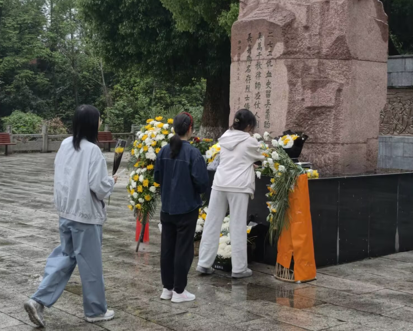 在烈士纪念碑前,全体师生整齐列队,向烈士默哀致敬。同学们手持白菊,依次敬献鲜花、鞠躬致意,以庄重仪式缅怀先烈功勋,寄托深切哀思。