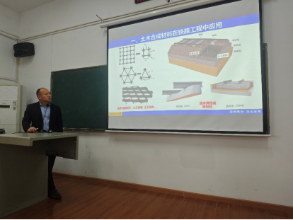 陈成老师结合自身多年科研与工程实践经验,用详实的数据、严谨的分析,将理论研究与工程应用紧密结合,详细介绍了团队研发的减震耙头、多向旋转吹砟装置、便携式背包吹砟机等系列高效轻便养护装备,完整展示了“病害诊断—参数优化—精准作业”的一体化工程实施路径,让在场师生清晰了解了有砟轨道智能维护的全链条技术体系。在交流互动环节,他耐心解答师生关于道砟劣化试验设计、智能装备研发、科研选题方向及行业发展前景等问题,鼓励同学们夯实专业基础、勇于创新实践,将理论知识运用到铁路基建一线,为国家铁路事业高质量发展贡献力量。